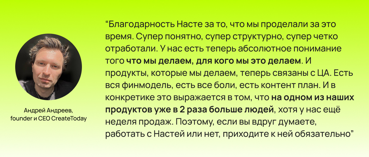 Рост Х4 по выручке одного из продуктов. Рекордные продажи с 20 человек до 130 человек. Андрей увидел силу моей методологии, а я его силу выстраивать эффективно процессы, и мы создали свою компанию, объединив усилия :)